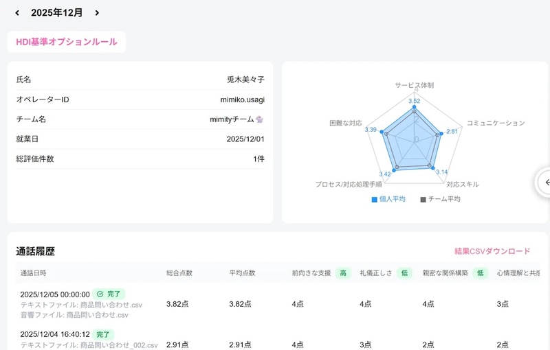 CAC identityの「mimity」は、同社の音声感情解析AI(人工知能)「Empath」を使って、コンタクトセンターにおける応対時の音響的な特徴を数値化し、顧客が感じる印象として可視化するサービス。このほど、応対品質をカスタマーサポートの国際標準である「HDI(Help Desk Institute)」に沿って評価するサービスをオプションに追加した(図1)。顧客視点で応対品質を評価し、モニタリング業務の効率化と品質改善の両立を支援するという。