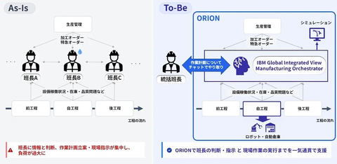 Global Integrated View Manufacturing OrchestratorとORIONのいずれもが、AI(人工知能)エージェントを装備する。前者ではユーザーインタフェースを提供し、自然言語による指示を可能にする。後者では、設備故障や欠勤、部材遅延、特急オーダーなどの発生を検知し作業計画を自動で組み直す。