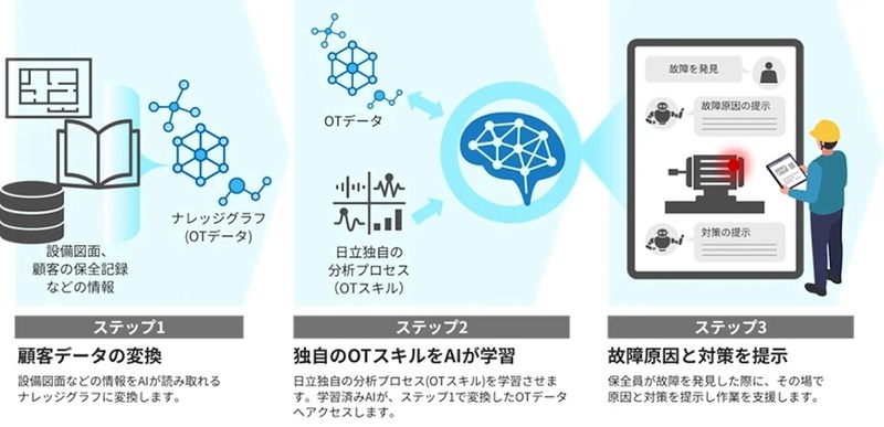 現場サポートAIナビの利用に向けてはまず、導入する企業の生産設備やユーティリティ設備などの図面を生成AIが読み取れるグラフ構造のナレッジグラフに変換する(図1)。同グラフと保全記録などのOT(Operational Technology:制御・運用技術)データと、日立が開発した設備故障原因分析プロセス「OTスキル」を生成AIに学習させてから現場に提供する。