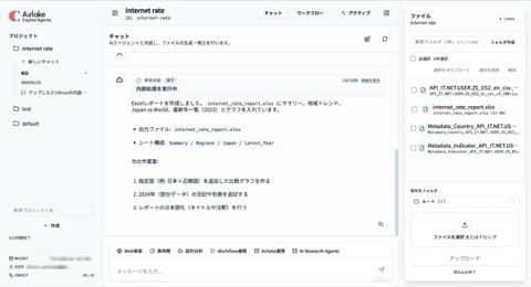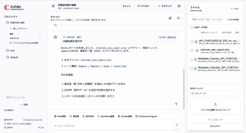 Airlake Copilot Agentsは、例えば「市場調査をして」といった自然言語による指示でも、複数のAIエージェントが役割を分担しながら調査から分析、資料作成までを実行する。ニュースなどの外部情報だけでなく、利用者がアップロードした資料や帳票データんなどを組み合わせた分析ができるという。