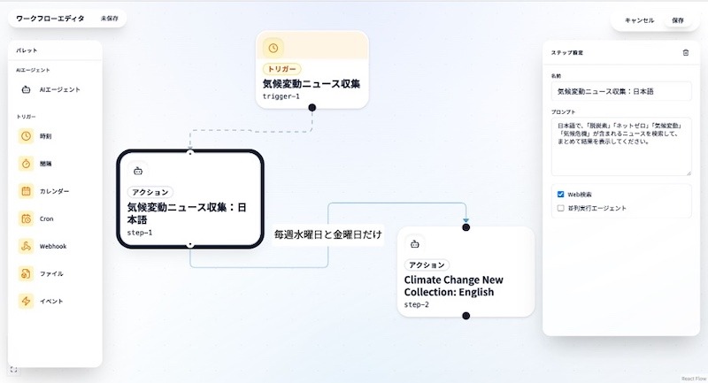 起動条件などを設定できるワークフロー機能を持ち、数時間や、夜間・休日を含めた日単位の業務をバックグラウンドで実行できるとしている(図2)。
