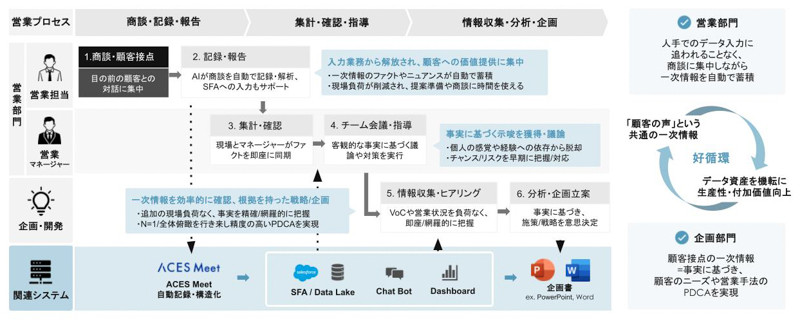 ACESは東京大学・松尾研発のスタートアップでAI(人工知能)ソフトウェアなどを開発している。同社が2026年2月13日に開始した「ACES Meeting Intelligence」は、商談や打ち合わせなどでの顧客との会話を収集・分析することで、営業戦略や商品企画を立案するまでの仕組みを構築するサービス(図1)。営業部門が日々取得するVoC(Voice of Customer:顧客の声)を各種の意思決定に生かせるようになるという。