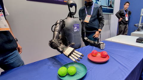 Atlasが使い勝手を強調するように、産業用ロボットは本体の機能や汎用性の高さに加え、運用のしやすさも重要になる。米Qualcommは、ベトナムのロボットスタートアップVinMotionとともに、さまざまな現場で使えるヒューマノイドロボット「VinMotion 2」を公開した。狭い場所でも人にぶつからずに歩いたり、モノの色やカタチを見分けて掴みあげたりするデモを披露していた(写真3)。
