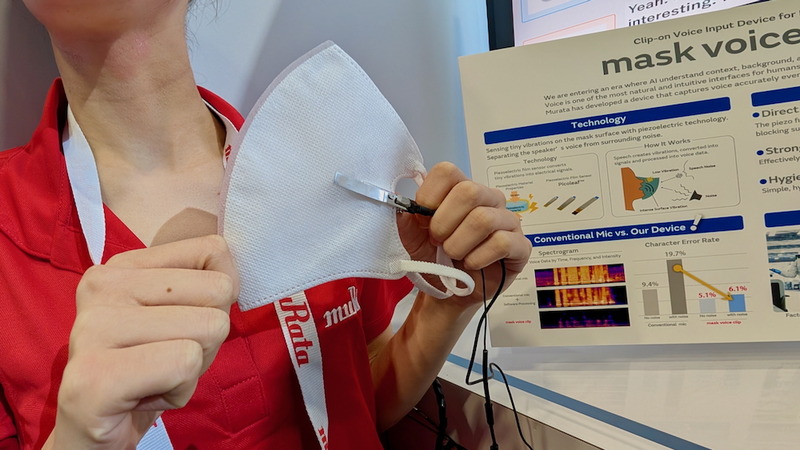 村田製作所の「mask voice clip」は市販のマスクに装着するクリップ型マイクを参考出品した(写真6)。周辺のノイズを抑えながら音声を拾う。基本技術としての展示で製品化は未定である。