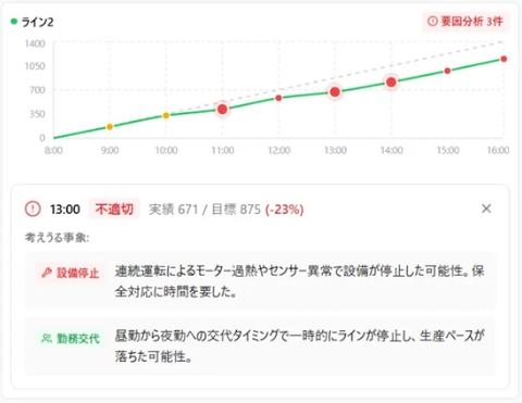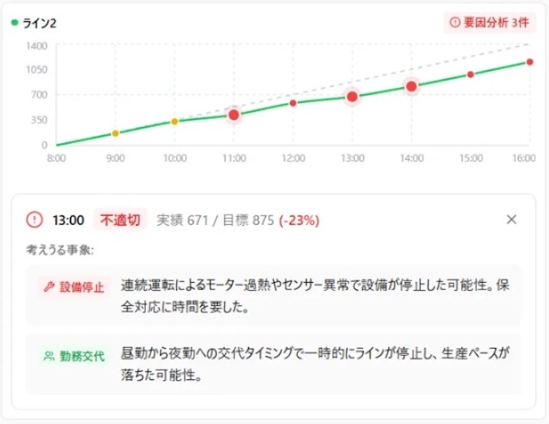 recoseeでは、生産数や在庫量、工程単位の事象などのデータを時系列で整理し可視化する。同データから生産計画と実績値の差異や、時間当たりの出来高が変化した要因をAI(人工知能)技術を使って推定することで、現場での要因特定のための切り口や改善点を提示する。計画はExcelなどで作成した既存計画にも対応する。