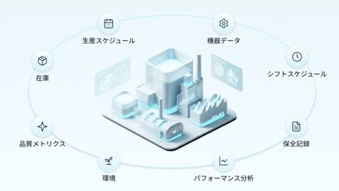 Streamが、工場内の機器やセンサーからデータを集約し一元管理する。対象データには、機器データのほか、シフトスケジュールや保全記録、性能分析結果、環境、品質メトリクス、在庫、生産スケジュールなどを含む。