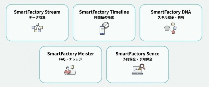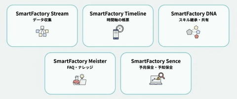 Classmethod SmartFactory AI Baseは、(1)SmartFactory Stream、(2)SmartFactory Timeline、(3)SmartFactory DNA、(4)SmartFactory Meister、(5)SmartFactory Senseの機能からなる(図2)。