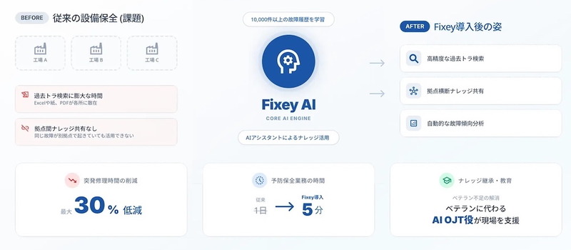 製造業向けのAI(人工知能)システムを手掛けるFAcraftの「Fixey」は、設備保全業務を支援するためのAIエージェント(図1)。現場に蓄積されている設備情報や修理履歴、マニュアルなどの保全データを利用し、設備トラブルへの対応や予防保全への移行などを支援する。既に大手自動車部品メーカーなどが導入しているという。
