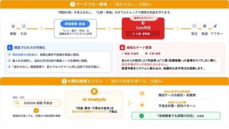 ワークフロー管理により、製造現場のデータと営業・販促データを連携し、商談プロセスを可視化する。納期や利益が一定の基準を満たさない場合は受注申請に進めないようにする「ゲート機能」を持ち、赤字受注や無理なスケジュールなどをシステム上で防止できる。営業担当者に製造現場の実態と離れた「できない約束」をさせない仕組みを整備できるとする。