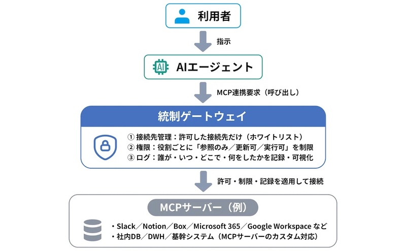 連携に当たっては、AIエージェントと各システムとの間に「統制ゲートウェイ」を設置し、通常MCPサーバーが持たない接続先の管理や権限の設定などの管理機能を補完する。