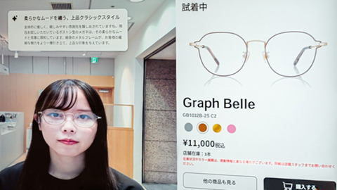 オンデーズは、全世界13カ国・地域で約600店舗を展開する眼鏡メーカー。今回、店頭で眼鏡を試着するためのサービスOWNDAYS MIRRORを開発し、東京・天王洲アイルに2025年8月20日にオープンしたモデル店舗に導入した(写真1)。2026年3月末までに国内全店への導入を計画し、海外店舗にも順次展開する。店舗の規模が小さく大型モニターの設置が困難な場合はタブレット端末での代用も検討している。