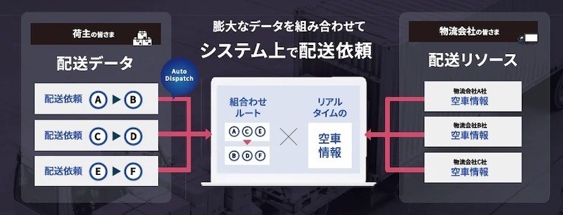 Auto Dispatchは、荷主の配送データと物流事業者の空車情報から輸配送案件に対し、配車効率が高まる最適な組み合わせを計算する。配車ロジックには、ベテランの配車担当者が持つノウハウを組み込んだ。