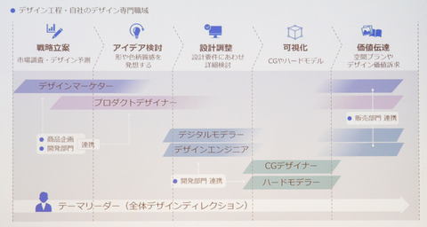 デザイン経営においては「デザインプロセスの革新」を新たな経営方針に掲げている。具体的には「デザイン本部の中で各工程に専門職を配置する分業体制を敷くことで、品質のバラツキや特定のデザイナーへの負荷集中を解消し、より専門性を高めつつ効率的なものづくりを目指すのが狙い」(島添氏)だ。従来は「1人のプロダクトデザイナーがコンセプトの立案から設計部門との調整まで全工程を担っていた」(同)という。