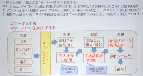 VCの確立に向けては最初、社内の設備や展示会用のデモ機を対象に試用を開始。「実際の現場で使えるソフトウェアを選択し、デジタルツイン上で試行錯誤を重ねることで現場でのデバック作業を減らすなどに取り組んだ。「手戻りを発生させないことは、自社にとっても顧客にとってもメリットになる」と松尾氏は強調する(図1)。