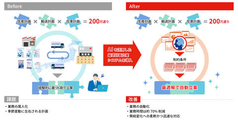 | 解決の仕組み | 理論上、約200万通りの組み合わせから最適な生産・輸送・在庫計画を数理最適化技術で導出する |