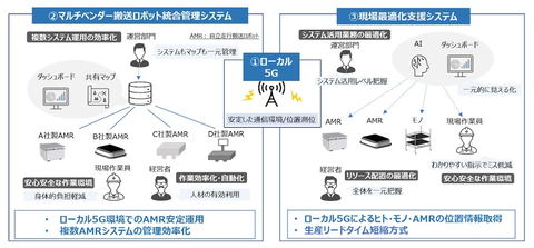 実証では、ローカル5G環境下でAMRを安定して運用できるかどうかと、複数メーカー製のAMRを使うことで従来作業をどれだけ代替できるか、および統合管理による管理負荷の削減効果とを検証する。