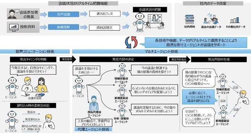 AIエージェントとしては、情報収集や分析、提案などの役割ごとに用意する。それぞれが会議に参加・議論することで多面的な分析や新しいアイディアの立案ができるとしている。社内資料や過去の会議データなども参照し、社内知識などを考慮した発言が可能になるという。