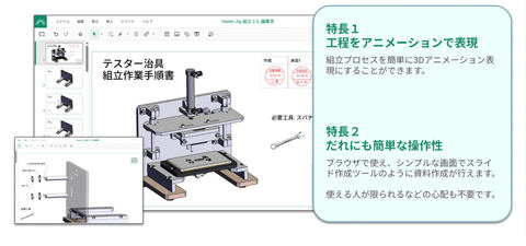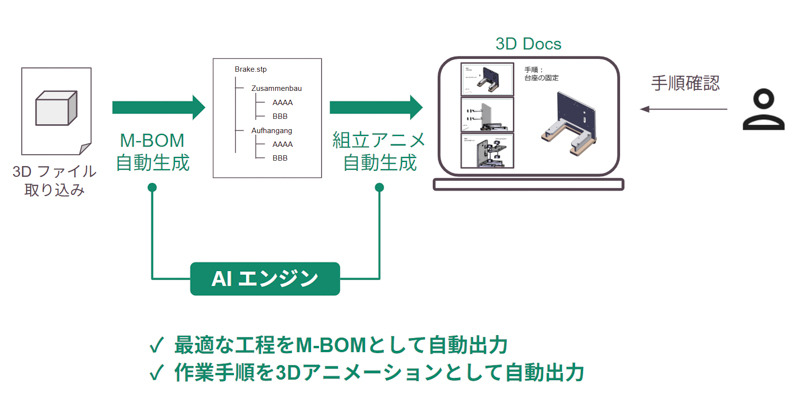 | 解決の仕組み | 3D CADデータをAI技術で解析し、組み立て工程のためのMBOMと3Dアニメーションによる作業手順書を自動で生成する |