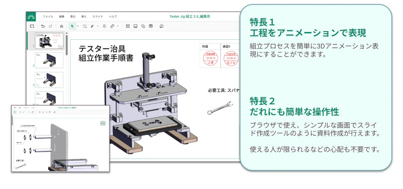 生成したMBOMを基に、部品の形状や組み付け順序を解析し、3Dアニメーション付きの作業書を生成する(図2)。製造担当者はPCやタブレットで作業書を閲覧し、ねじやスパナといった必要部品や工具の使い方、紙のマニュアルでは伝わりにくい台座を固定する際などの動きや角度を確認できる。