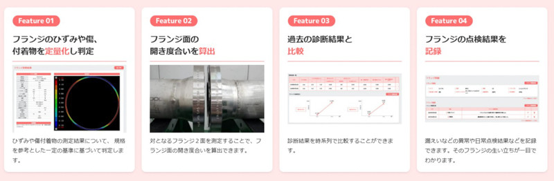 | 解決の仕組み | フランジ面を3Dスキャナーで計測し、ひずみや凹凸、ズレなどの定量数値から状態を判断できるようにする |