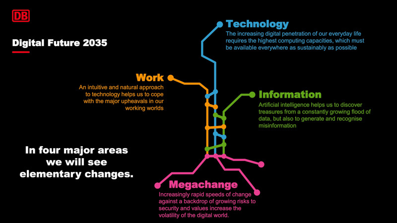そのマンテ氏は、2035年のデジタル未来像として「技術(Technology)、仕事(Work)、情報(Information)、メガチェンジ(Megachange)の4つの主要領域で根本的な変化が起きる」と予測する(図2)。