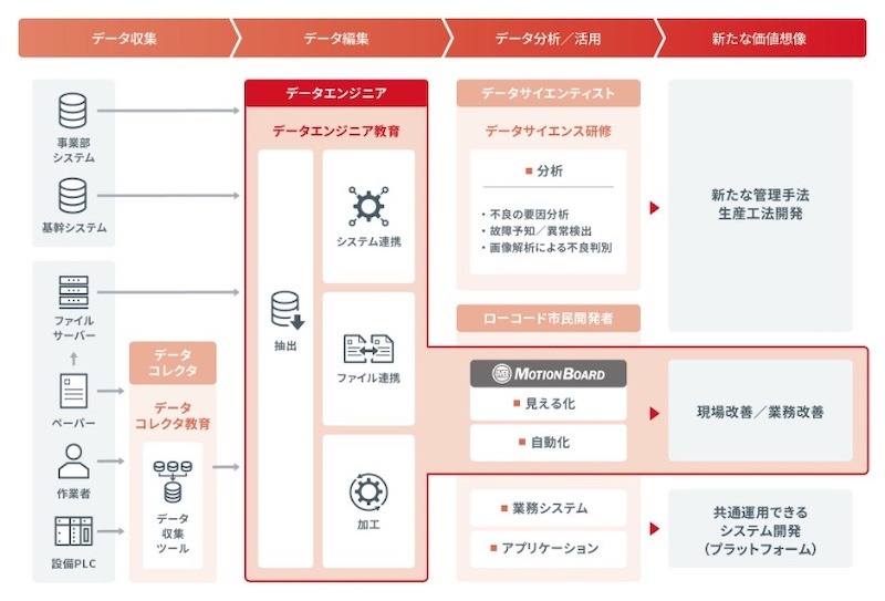 データエンジニアの教育プログラムでは3カ月をかけて、データの加工・整理からデータベースへの格納、データの可視化までのプロセスを学習する。学習の成果を最終報告会で報告し、成功事例はデータ活用基盤上に作成されている「卒業生ボード」で公開し社内で共有する。データ活用基盤には「MotionBoard」(ウイングアーク1st製)を採用している。