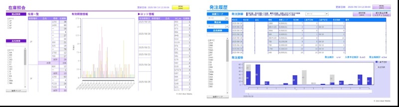 データエンジニアによる活動例の1つに、部材の在庫照会画面と発注履歴画面の開発がある(図2)。有効期限が近いロット情報を在庫照会画面に表示し、現場での先入れ・先出し判断を促す。発注情報や納期回答日、発注残数などを発注履歴画面に一覧表示することで過剰発注を防止する。これらにより部材の管理精度が高まり、過剰在庫を60%、部材廃棄量を94.6%、作業負荷を75%、それぞれ削減したとする。