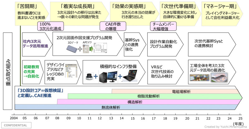 その後は、3D設計のコアを「形状作成」ではなく「設計検証」に位置付け「シミュレーションのテクニックを熟練者について習得すると同時に、IT領域の知識も吸収していった」(南山氏)