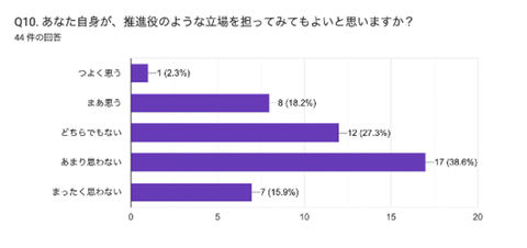 研修参加者44人を対象にアンケートによれば、生成AI技術を利用していくために「推進役が必要」とする回答は79.6%に上る。ただ「自身が推進役のような立場を担ってもよい」との回答は20.5%にとどまり、必要性と担い手の意欲との間には、まだギャップがある(図1)。
