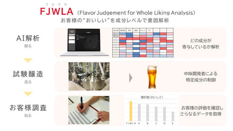 商品開発者は、解析結果を基においしさに寄与する成分を技術的にコントロールしながら飲料を試作する。試作品は消費者に試飲してもらい、他製品と比較しながら、おいしさを調査する。得られた評価コメントなどを新たなデータとして統合し、FJWLAの分析の精度を高めていく。
