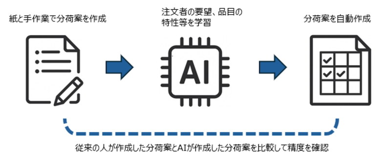 導入に向けてはこれまで、グループの東京シティ青果において実証実験を実施してきた(図1)。営業担当者が持っている注文者の要望や品目の特性などの情報・ノウハウをAIモデルに学習させ、それらを考慮した分荷案を自動生成させた。