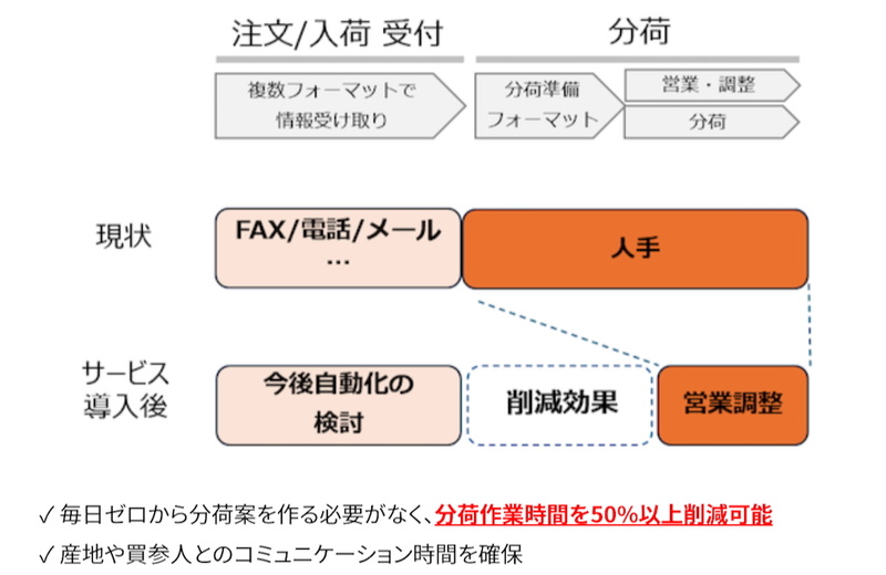 | 課題 | 青果物卸売市場における分荷業務は、電話やFAXなどアナログな手法が多いほか、属人化が進んでおり、長時間労働や作業ミスが発生するほか、技能継承が難しい |