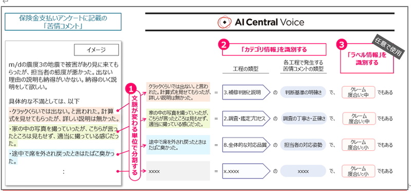 あいおいニッセイ同和損害保険が導入したのは、非構造化データを分析するためのAIエージェント。顧客の声(VoC:Voice of Customer)や従業員のフィードバックコメントなどから、従来は困難だった苦情因子や頻出照会の特定や、苦情の類型や量感の変遷を追跡し、データに基づく新規施策の検討や既存施策の効果測定などに利用する(図1)。頻出照会を意識したFAQ(良くある質問と答)を照会応答システムに取り込み対応品質の向上と照会件数の削減も期待する。
