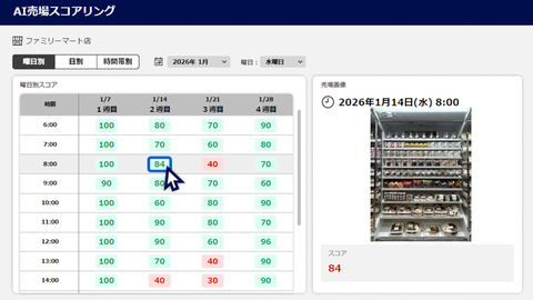 ファミリーマートが実証する「AI売場スコアリング」は、店舗の売り場の状態を防犯カメラ映像から評価するためのAI(人工知能)システム。店頭の状態を数値化し客観的に把握することで、品ぞろえの最適化と販売機会の最大化を図るのが目的だ。首都圏の一部店舗で2026年1月中旬から実験を始めている。