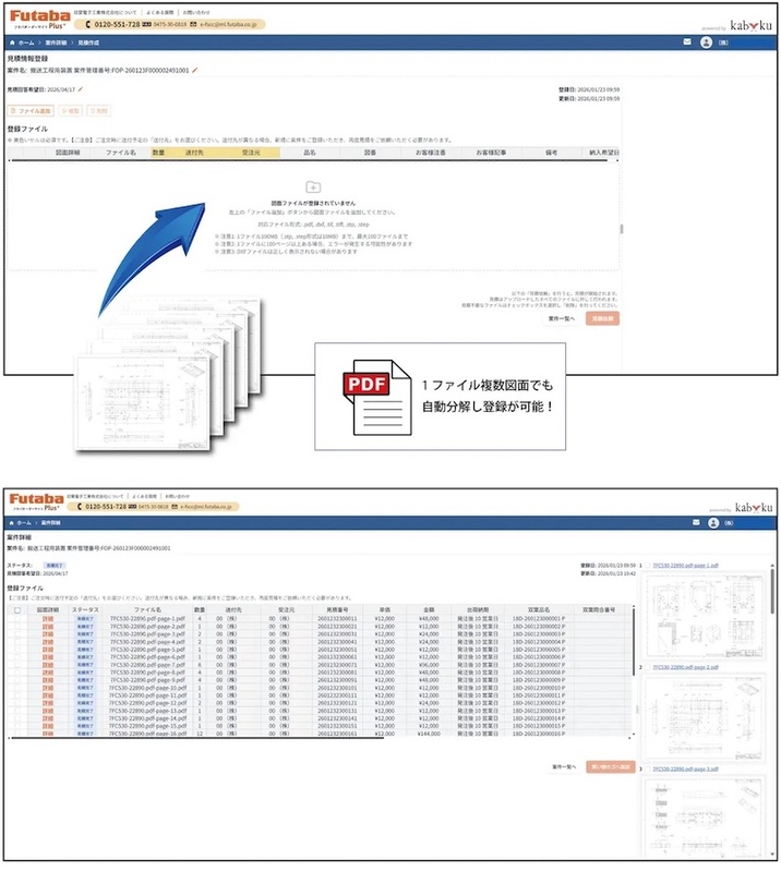 双葉電子工業の「フタバオーダーサイトPlus(FO Plus)」は、同社のEC(電子商取引)サイト「フタバオーダーサイト」の最新版。設備用加工部品における角物や丸物の切削加工、旋盤、板金、製缶、表面処理などを対象に、2D(2次元)図面のPDFやCAD(Computer Aided Design:コンピューターによる設計)データからの見積書作成や受注処理を可能にした。