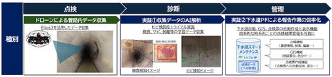 | 解決の仕組み | ドローンとAI技術などを組み合わせて、下水道管路の点検から診断、管理までを一気通貫に実施できる仕組みを構築し、点検業務の自動化・無人化を図る |