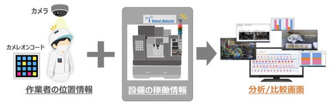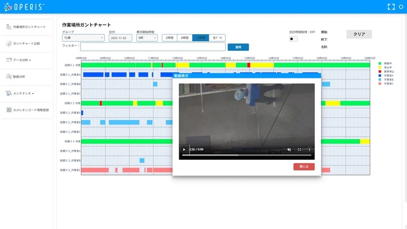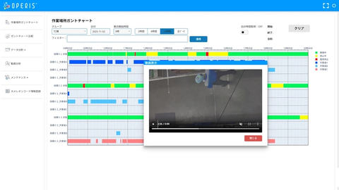 作業者と設備の動きを組み合わせてガントチャートで表示できる(図2)。現状と過去のガントチャートの比較が可能で、熟練者と新人の動きの違いや、異常時の変化、時間差や滞留、ムダを確認できるという。気になる箇所があれば、その際の動きを動画で確認できる。