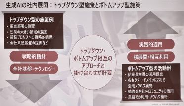 さらに吉田氏は、生成AIシステムを全社員に展開する際の“コツ”として「トップダウンとボトムアップの双方の施策が必要だ」と強調する(図3)。