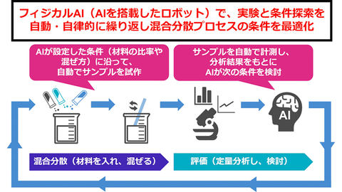 混合分散ROPESでは、条件設定・試作・計測の一連をAI技術が自律的に実行する。設定した条件に基づいてサンプルを作成し、粒子径分布測定装置などで計測した結果をデータとして取得する。粒子の大きさのバラツキである粒子径分布などから分散状態を評価し、その結果を基に混合条件を更新して次の試行へとフィードバックする。