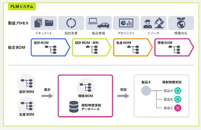 PLMでは、設計段階で作成する設計BOMと、生産工程で用いる生産BOMを統合する。これらのBOMに規制物質情報データベースを連携することで、環境情報を付加した環境BOMを生成する。