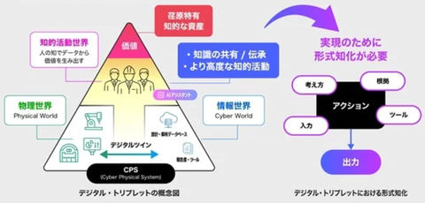 知識駆動型AIプラットフォームには、物理(フィジカル)空間とデジタル(情報)空間に、知識空間を統合する三層構造「デジタルトリプレット(Digital Triplet)」の概念を採用した(図2)。東京大学 教授の梅田 靖 氏の提唱によるもので、双対構造のデジタルツインを拡張し、AI技術が知識を推論し、継承・再利用するための枠組みとなる。